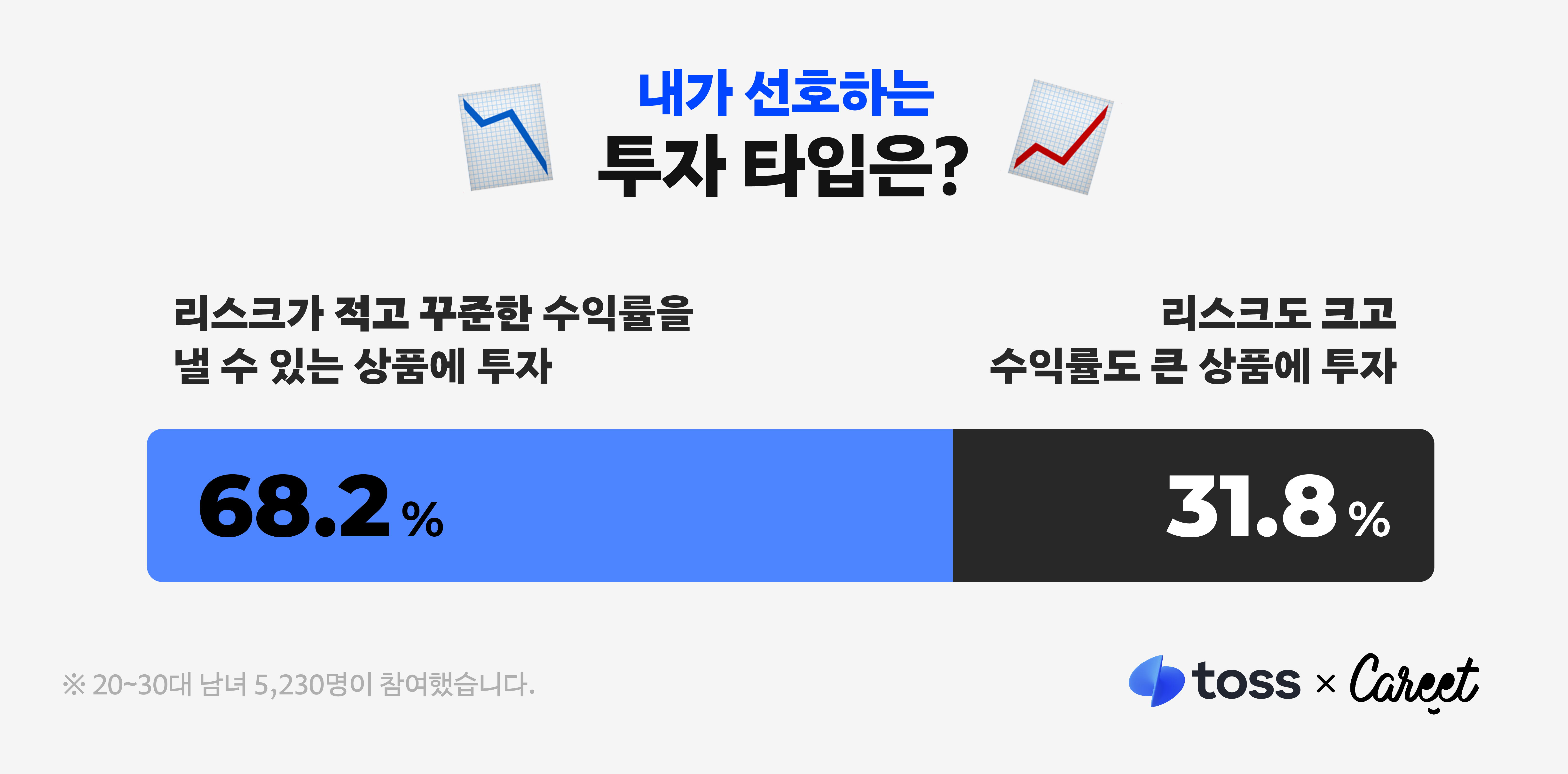 몇 년 전, ‘영끌(영혼까지 끌어모아 투자)’, ‘빚투(빚내서 투자)’라는 신조어가 생길 정도로 무리한 투자를 감행하는 MZ세대가 눈에 띄게 증가한 적 있습니다. 변동성이 큰 가상화폐 투자에 뛰어드는 경우도 많았죠. 그런데 캐릿X토스 설문조사 결과, 요즘의 투자 방식은 과거와 달라지고 있음을 확인할 수 있었어요. ‘리스크가 적고 꾸준한 수익률을 낼 수 있는 상품(68.2%)’을 선호하는 비율이 ‘리스크도 크고 수익률도 큰 상품(31.8%)’을 선호하는 비율보다 2배 이상 높게 나타난 겁니다.