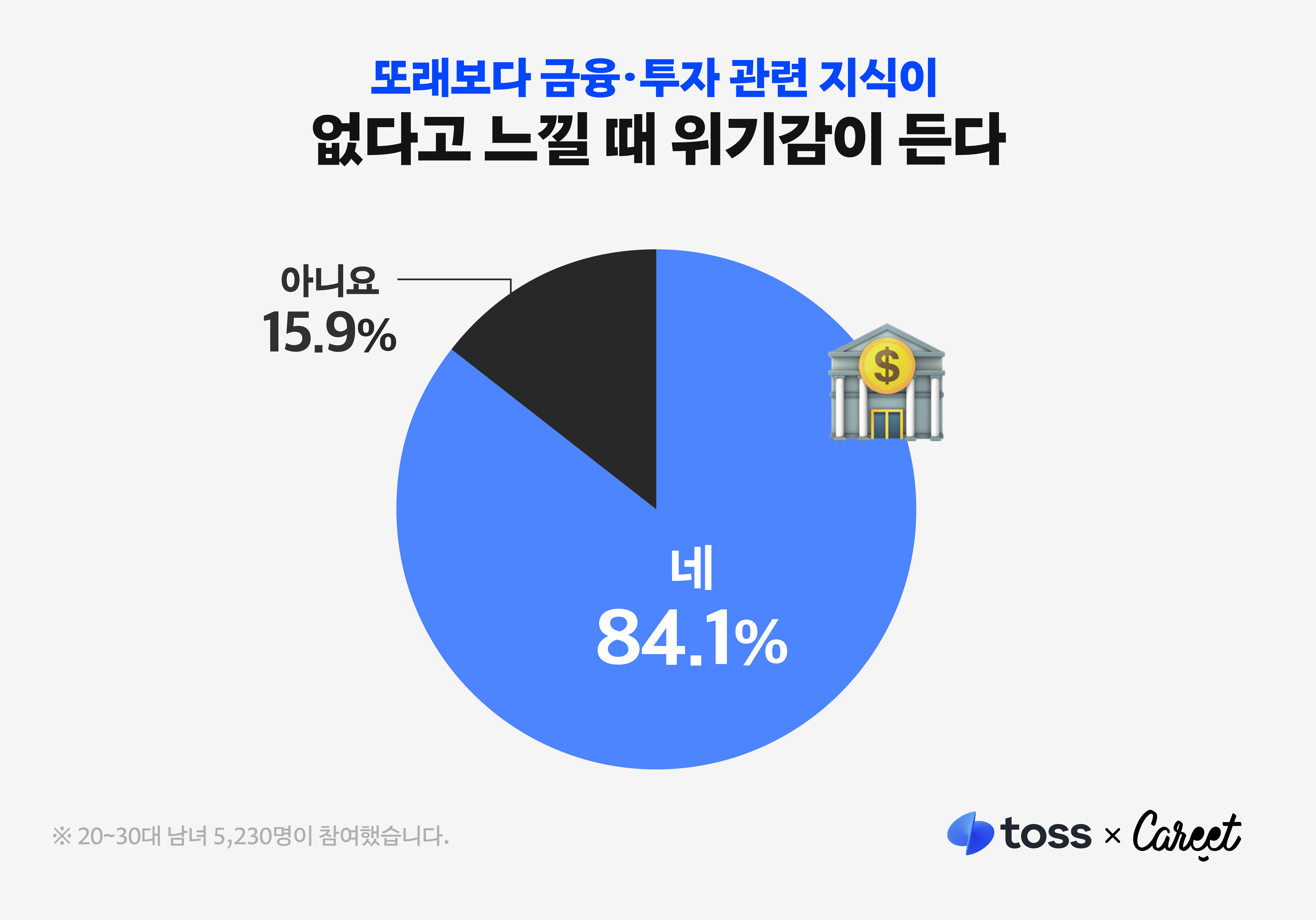 그렇다 보니, 스스로 재테크 지식이 없다는 자각이 들면 위기감을 느끼기도 한답니다. 캐릿과 토스는 MZ세대 재테크 트렌드를 알아보기 위한 공동 설문조사를 진행했는데요. 그 결과, 20~40대 남녀 5,230명 중 ‘또래보다 금융·투자 관련 지식이 없다고 느낄 때 위기감이 든다’라고 답한 비율이 84.1%로 나타났습니다. 사실 팬데믹 때만 해도 재테크에 대한 뚜렷한 지식 없이 남들이 좋다는 종목에 ‘묻지마 투자’를 하는 경우도 자주 눈에 띄었는데요. 이제는 금융·투자 관련 지식의 중요성을 크게 깨닫고 있는 겁니다.