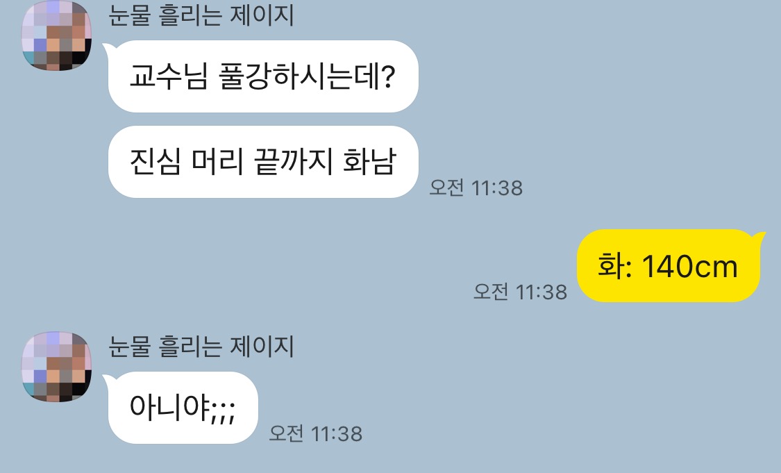 지난 5월 엑스에서 처음 퍼지기 시작하여 최근까지 활발히 사용되고 있는 밈입니다. ‘화가 머리끝까지 난다’라는 말에 ‘화: 120cm’라고 대답하는 방식인데요. 발끝부터 머리끝까지 고작 120cm밖에 되지 않는다는 의미로, 친구의 키가 작은 것을 놀릴 때 주로 사용됩니다. 친구끼리 대화할 때 가볍게 쓰이는 밈이에요.