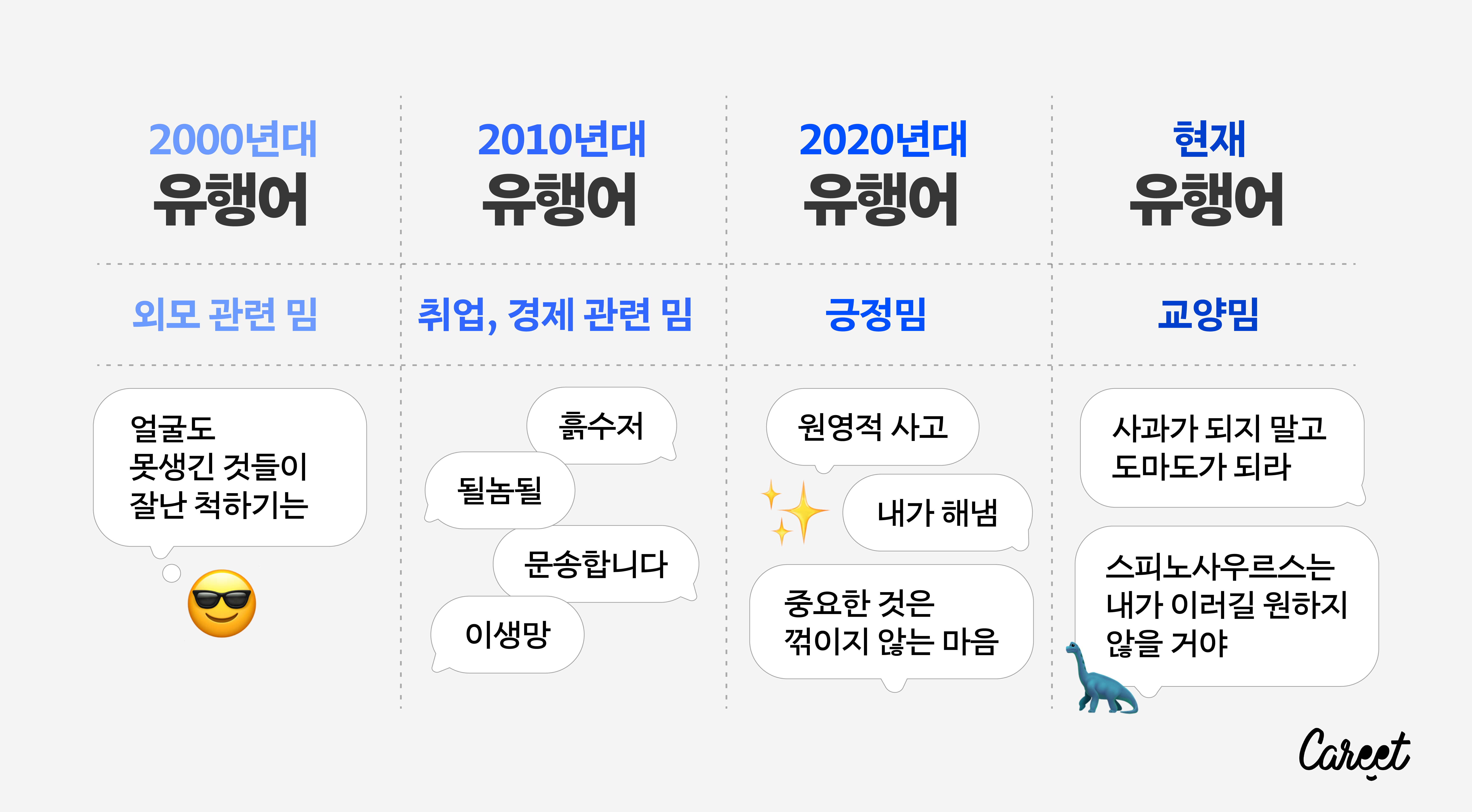 밈의 소재도 트렌드를 탄다는 이야기, 공감하시나요? 2000년대에는 외모를 소재로 한 밈이 흥행했고요. 2010년대에는 흙수저, 이생망, 문송합니다 등 취업 세태나 경제 상황을 반영한 밈이 주목을 받았죠. 이후 온라인 소통이 활발해지면서 전 세계적으로 밈의 탄생 주기는 더욱 짧아지고 있는 상황인데요. 지난해 ‘원영적 사고’ 같은 긍정밈이 눈길을 끌었다면, 올해는 또 새로운 경향이 돋보이고 있습니다. (관련 콘텐츠: 될놈될부터 원영적 사고까지, 밈으로 보는 Z세대의 가치관) 이를 한 장으로 살펴보면 다음과 같아요!