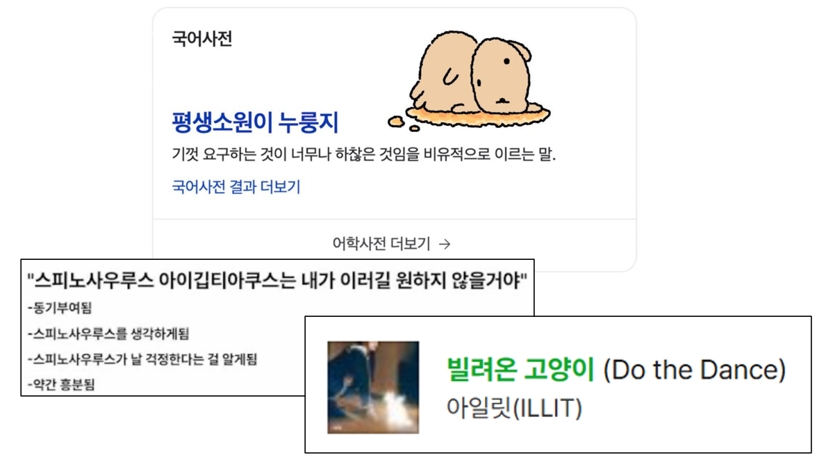 최근 인기를 끌었던 유행어나 짤을 몇가지 살펴볼까요? 먼저 ‘빌려온 고양이 같이’나 ‘평생 소원이 누룽지’ 같은 생소한 속담들이 재조명되며 인기를 끌었어요. 이와 함께 ‘스피노사우르스는 내가 이러길 원하지 않을 거야’처럼 마이너한 공룡을 언급하는 짤도 활발하게 공유됐고요. 온라인 커뮤니티에서는 ‘깻잎 논쟁’ 대신 사도세자와 영조의 대립을 두고 분석하는 게시물들이 여러 차례 인기글로 등극했습니다. 이전에는 교양으로 여겨지던 지식들이 마치 밈처럼 재미있게 소비되는, ‘교양밈’ 트렌드가 도래한 거예요.