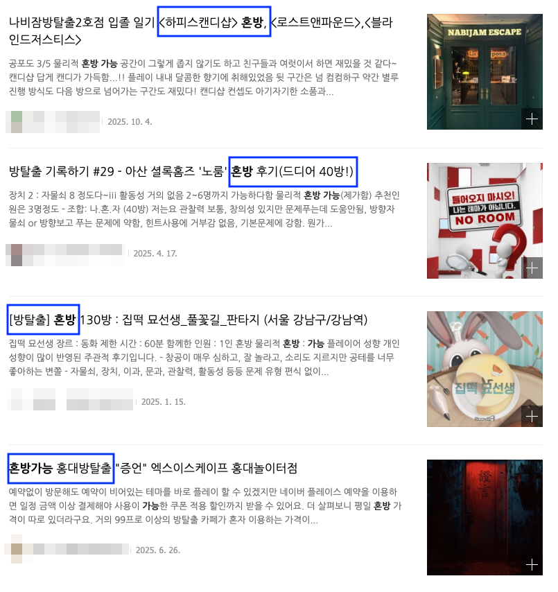 저는 방탈출 게임이 취미예요. 요즘 방탈출 후기를 보면, 혼방(혼자 하는 방탈출)에 대한 니즈가 커졌다는 걸 느껴요. 방탈출 후기를 전문적으로 작성하는 고수분들은 후기에 ‘혼방 가능 여부(두 명이 협동해야 하는 장치 없이, 물리적으로 혼자 미션을 깰 수 있는 테마)’를 꼭 덧붙이더라고요. 실제로 일부 방탈출 카페에서는 혼방 요금을 별도로 안내하기도 하고요. 방탈출은 가격대가 높고, 취미로 삼는 사람이 아주 많은 편은 아니라서 콘셉트가 마니악하거나 난이도가 높을 경우 지인들과 가기 어려워요. 그러다 보니 아예 혼방을 즐기는 사람들도 늘어난 것 같습니다. 박채연(24세, 대학생) |