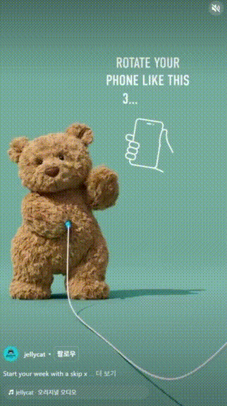 출처 젤리캣 인스타그램(@jellycat)인스타그램 피드를 넘기다가 이런 릴스 한 번쯤 본 적 있으시죠? 팔로워에게 특정 행동을 유도해서 따라 하게 만드는 영상이요. 위에 예시로 보여드린 인형 브랜드 ‘젤리캣’이 올린 릴스도 마찬가지입니다. 첫 화면에 스마트폰을 한 방향으로 돌려보라는 안내가 나오는데요. 전환된 다음 장면부터 마치 팔로워가 줄넘기 끈을 함께 돌리는 것처럼 연출됩니다. 즉, 팔로워와 영상이 상호작용을 하는 것처럼 착각하도록 만드는 거죠.
