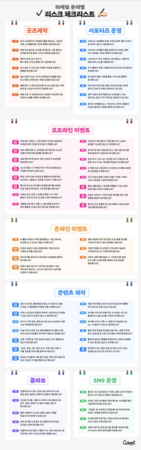 이러한 문제는 비단 SNS 콘텐츠 제작이나 운영에만 국한되지 않습니다. 온오프라인 이벤트나 굿즈를 기획할 때도 아주 작은 포인트 하나가 소비자의 마음을 사로잡을 수도, 멀어지게 할 수도 있으니까요. 결국 중요한 건 리스크가 될 만한 포인트를 많이 알아두는 것일 텐데요. 캐릿이 실무자를 대상으로 인터뷰를 진행해, 마케팅 분야별로 조심해야 하는 포인트를 한데 모아왔습니다. 특히 놓치면 역풍 맞기 쉬운 고위험 리스크는 물론, 마케팅 기획 단계에서 미리 점검하고 예방할 수 있는 포인트들도 함께 정리했는데요. 실무자들이 직접 발로 뛰고 데어가며 수집한 꿀팁들이 가득하니 꼼꼼히 살펴보고 놓친 부분이 없는지 점검해 보세요!