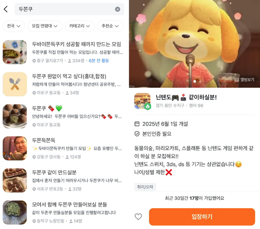 (좌) 최근 당근에서 인기를 끈 두쫀쿠 모임 (우) 닌텐도 게임을 모여서 같이 하는 모임, 출처 당근이쯤에서 ‘예전에도 단기로 만나는 모임은 많았는데… 뭐가 다른 거지?’라는 의문이 드실 수 있는데요. 실제로 영어 회화 모임, 줌 스터디처럼 짧은 기간 함께하다가 해산하는 형태의 모임은 꾸준히 있었습니다. 다만 이런 모임들은 대체로 공부나 자기계발처럼 생산성을 목표로 결성된 경우가 많았죠. 반면 숏셜링은 성과보다 재미있는 경험 자체를 즐기기 위해 모인다는 점에서 궤를 달리합니다. 일례로 두바이 쫀득 쿠키(이하 두쫀쿠)를 여럿이 만들거나, 각자 두쫀쿠를 가져와 리뷰하는 ‘두쫀쿠 모임’도 인기를 얻고 있고요. 경도 모임처럼 다인원이 모여야만 시작할 수 있는 모임뿐 아니라, ‘모여서 각자 게임 하기’처럼 혼자 해도 되는 활동을 굳이 같이 즐기는, 재미