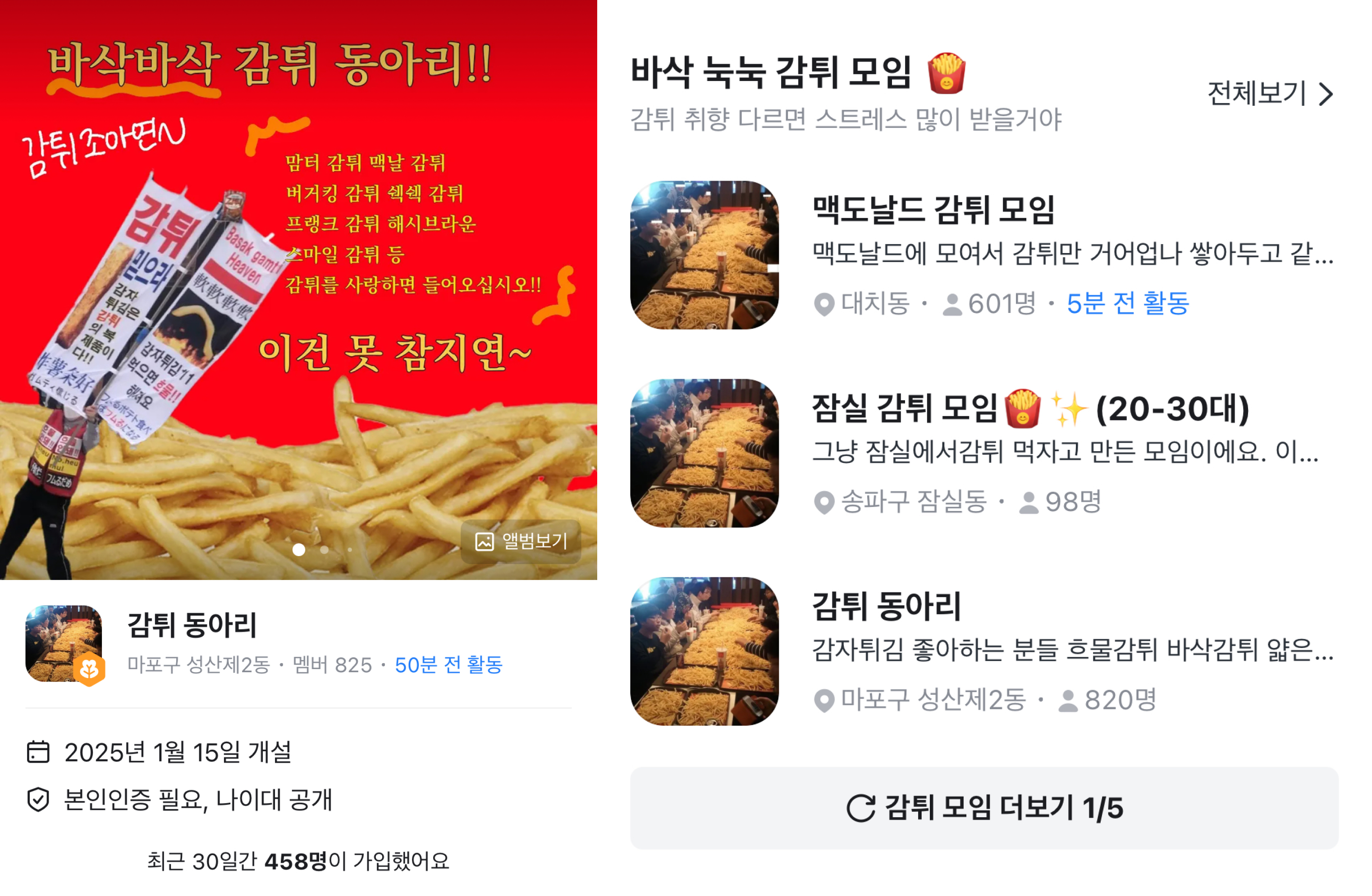 (좌) 서울 마포구 감자튀김 모임 (우) 당근 앱 상단에 노출된 감자튀김 모임 목록, 출처 당근‘경도 모임‘에 이어, 1월 말부터는 패스트푸드점에 모여 감자튀김을 대량으로 주문해 나눠 먹는 ‘감튀 모임’이 유행하고 있죠. 이렇듯 올해 초 국내 SNS를 떠들썩하게 만든 숏셜링 모임들은 플랫폼 ‘당근’을 통해 확산됐다는 공통점이 있습니다. 당근에 탑재된 ‘당근 모임’ 기능이 동네 주민들을 연결하는 커뮤니티의 역할을 하면서, 모임 트렌드를 주도하게 된 건데요. 실제로 당근의 연말 결산 자료에 따르면, 2025년 누적 모임 가입자 수는 전년 대비 125% 증가했다고 합니다. 지난해 12월 이후 숏셜링 모임이 연이어 화제가 되면서, 이용 규모는 더욱 확대됐을 것으로 예측돼요.