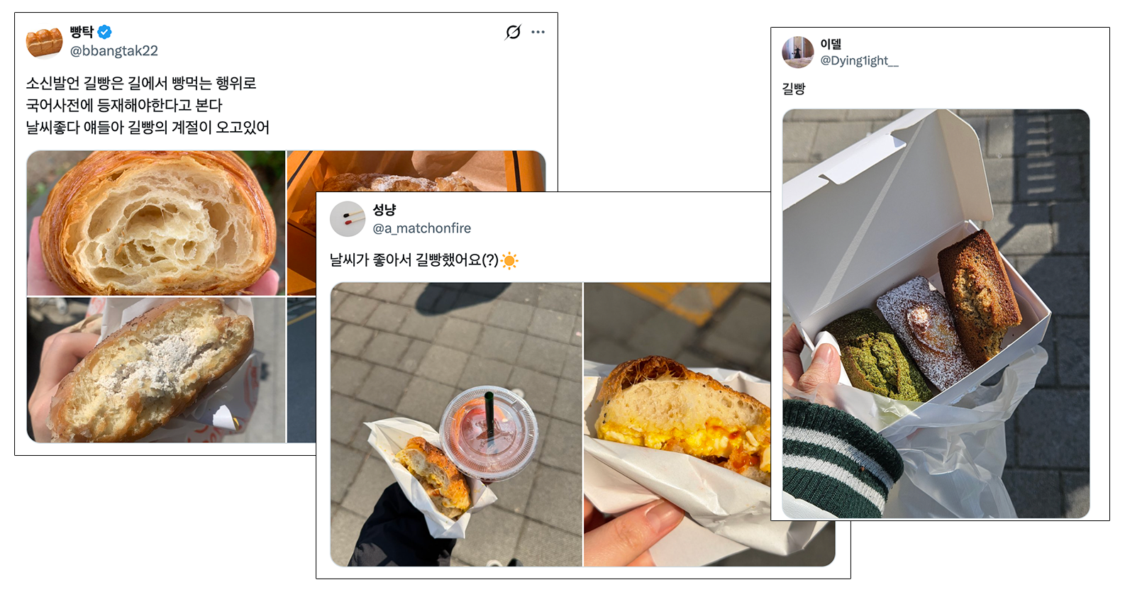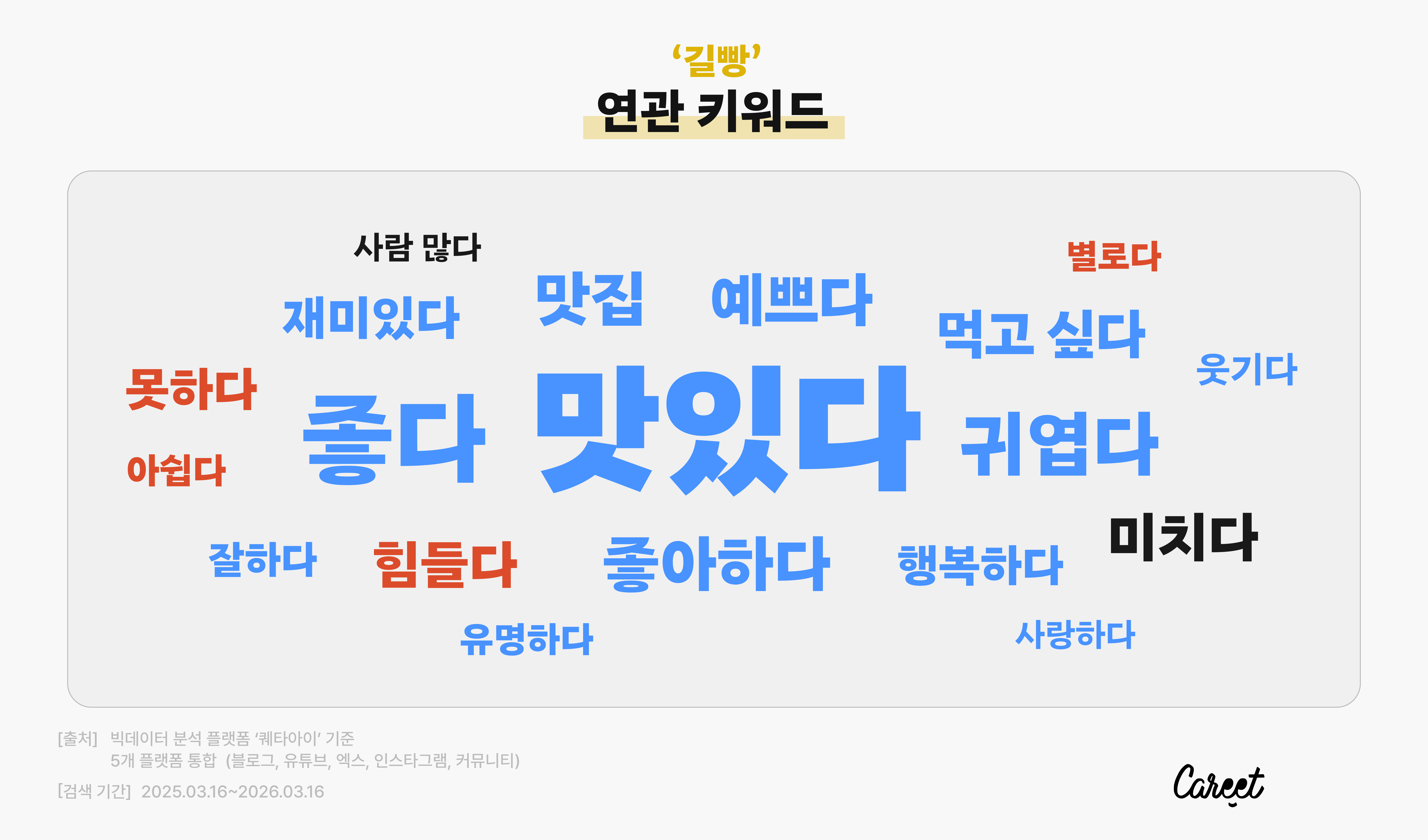 출처 (좌측부터) @bbangtak22(엑스), @a_matchonfire(엑스), @Dying1ight__(엑스)길빵이라는 단어를 들었을 때 길 한복판에서 담배를 피우는 행위가 먼저 떠올랐다면 주목해 주세요. Z세대 사이에서는 길빵이 전혀 다른 의미로 사용되고 있습니다. Z세대에게 길빵이란, 길거리에 서서 혹은 돌아다니면서 빵을 먹는 것을 의미해요. 실제로 SNS를 살펴보면 길빵 인증샷을 올리는 Z세대를 쉽게 찾아볼 수 있습니다. 데이터를 봐도 길빵의 연관 키워드로 ‘맛있다’나 ‘좋다’ 같은 긍정적인 표현이 주로 등장하고 있어요.