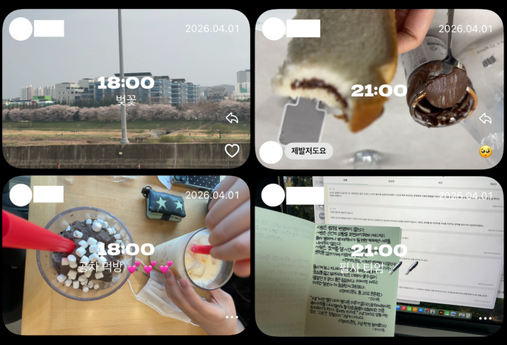 ✔ 앱을 설치한 뒤 단체방을 만들어 친구를 초대하면 모든 사용자에게 한 시간마다 알림이 감. 이때마다 2~4초씩 영상을 찍어 올리면 각자의 영상이 실시간으로 누적됨.
