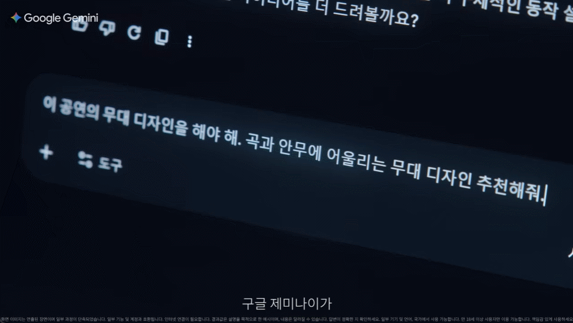 - 이를테면, 무대의상 감독이 벤쿠버 올림픽 의상을 제미나이에 입력한 후 발레 의상으로 재구성하는 아이디어를 얻는 식. 혹은 제미나이에게 ‘죽음의 무도’ 안무와 어울리는 무대 디자인 평면도를 요청하고, 출력된 결과물을 바탕으로 제작팀과 조명팀이 실제 무대를 연출하기도 함.