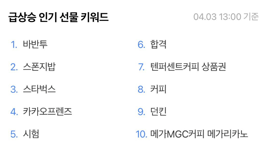 - 100,000 이상: 대중적인 관심을 받는 소재의 키워드은 18,500건. 불교박람회 기간 카카오톡 선물하기 내 급상승 인기 선물 키워드 1위를 기록하기도 함.