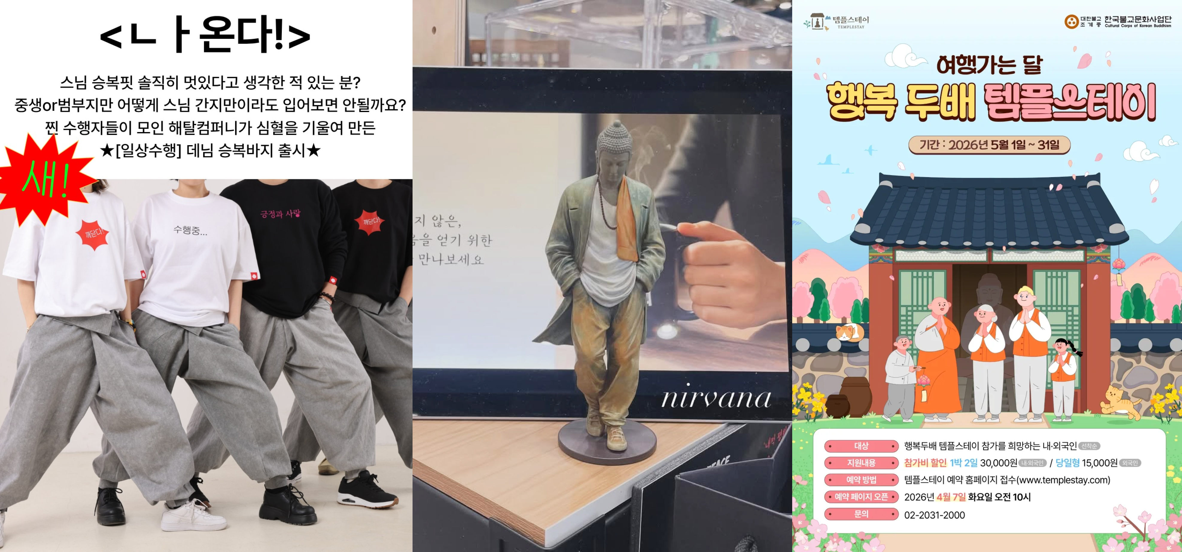 (왼쪽부터) 해탈컴퍼니 승복 바지, 니르바나 부스에 전시된 부처 조각상, 행복 두배 템플스테이 포스터출처 (왼쪽부터) 해탈컴퍼니 인스타그램, 니르바나 인스타그램, 템플스테이 홈페이지