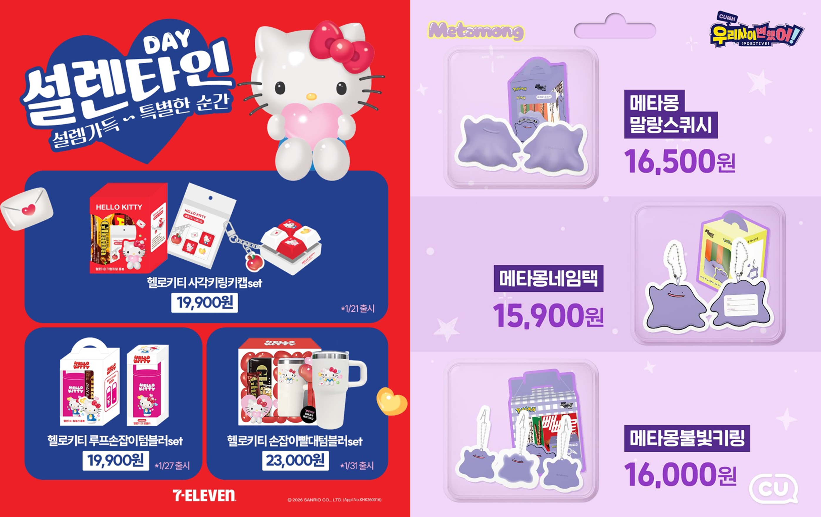 (좌) 헬로키티 콜라보로 화제가 됐던 세븐일레븐 밸런타인데이 굿즈(우) 메타몽 콜라보로 인기를 끌었던 CU 빼빼로데이 굿즈