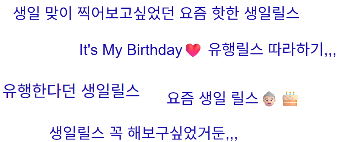 특히, Z세대 사이에선 생일이 하나의 콘텐츠 소재로 통하고 있습니다. 일례로 ‘생일 릴스’, ‘생일 틱톡’ 영상이 크게 유행하고 있다는 점을 들 수 있어요. 일종의 ‘생일 챌린지’라고 생각하시면 되는데요. 인스타그램엔 3,800만 건, 틱톡엔 3,100만 건의 관련 영상이 올라와 있습니다. Z세대는 자신의 생일이 아닐때도 피드에 뜬 생일 챌린지 영상을 챙겨보고, 나중에 써먹기 위해 저장을 해두는 경우도 많다고 해요.