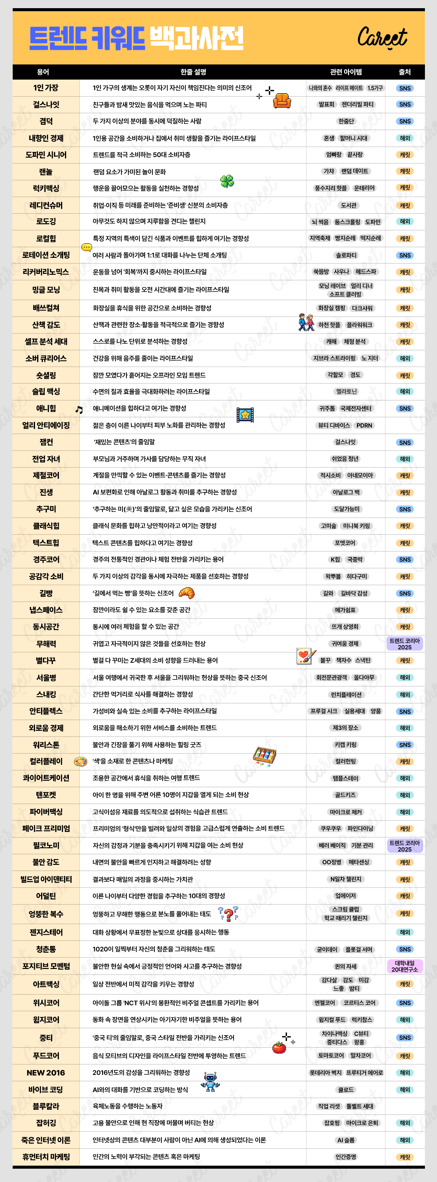 하지만 막상 찾으려고 하면, 우리 브랜드 기획에 핏한 트렌드 키워드가 쉽게 떠오르지 않을 때가 많습니다. 그래서 캐릿이 독자분들이 업무에 바로바로 사용하실 수 있도록 산발적으로 흩어진 최신 트렌드 키워드를 모았습니다. 국내외 트렌드 키워드는 물론, 최신 SNS에서 자주 쓰이는 신조어를 폭넓게 담았고요. 제안서의 설득력을 더해줄 정량 지표와 최신 사례, 출처까지 한눈에 보기 좋게 정리했습니다. 이번 콘텐츠를 북마크하시고, 필요하실 때마다 꺼내보세요!
