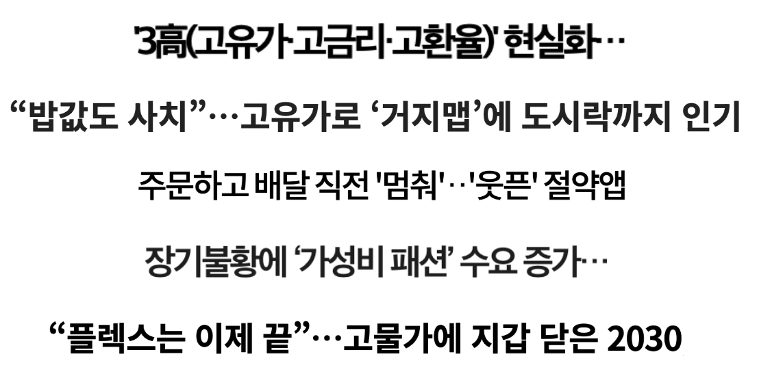 요즘 뉴스에서 ‘고유가’·‘고환율’·‘고금리’ 같은 키워드, 자주 접하시죠? 경제 상황이 악화되면서 소비자들의 부담이 커졌다는 점을 피부로 체감하고 계실 텐데요. 경기 침체가 장기화되는 만큼, 이에 적응하는 소비자들의 라이프스타일에도 여러 변화가 나타나고 있습니다.