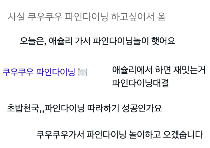 | ‘쿠우쿠우에서 파인다이닝 즐기기’라는 영상을 인스타그램에서 본 적 있는데요. 단순히 있어 보이는 표현을 쓰는 게 아니라, ‘더들리’, ‘텐 Ten’처럼 파인다이닝 리뷰 유튜버들의 영상에서 자주 보던 표현이 나와서 놀랐어요. ‘곁들인 채소는 블랑싱 후 소테했다’ 같은 표현이요. ‘흑백요리사’ 같은 요리 경연 프로그램이나 파인다이닝 리뷰 콘텐츠를 자주 접하다 보니 콘텐츠를 만드는 사람도, 보는 사람도 고급 식문화에 관한 이해도가 높아진 것 같아요. 이진우(23세, 대학생) |