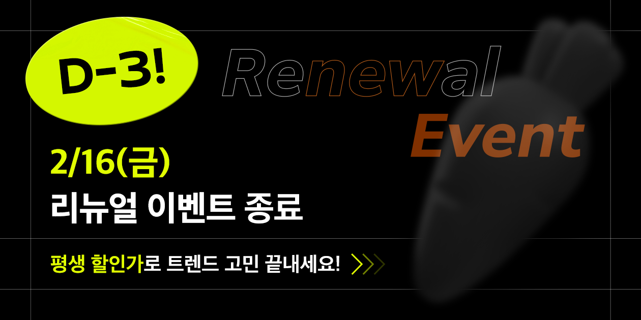 2024 새해 캐릿 리뉴얼 이벤트가 단 3일 남았습니다. 캐릿에서 무려 2년 반 만에 여는 평생 할인가 이벤트인데요. 지금 바로 캐릿 멤버십 회원이 되어 리뉴얼 혜택을 누리세요! ✔ 트렌드 라벨 ✔ 마이크로 트렌드 전광판 ✔ 주간 인기 차트 등 새로운 서비스도 추가 됐어요. |